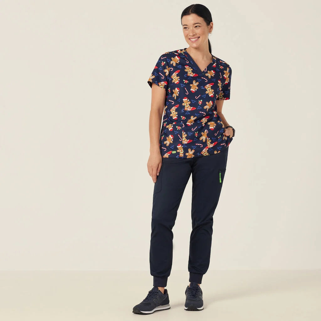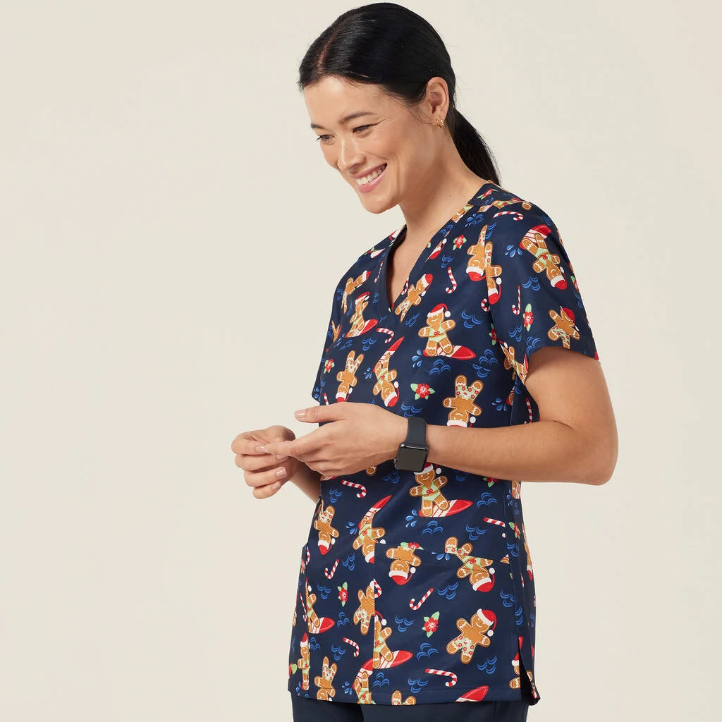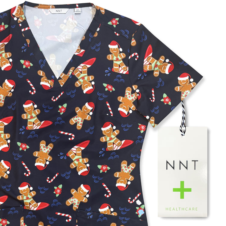 CATUXV - Womens NNT Xmas Gingerbread Surfer Print Scrub Top - Midnight Navy