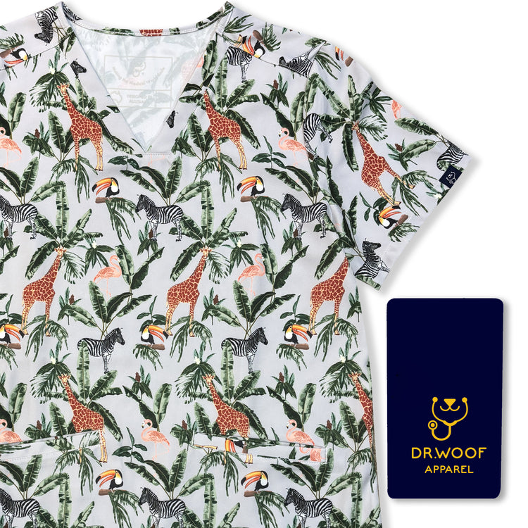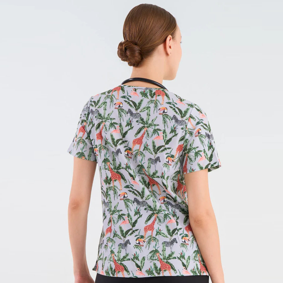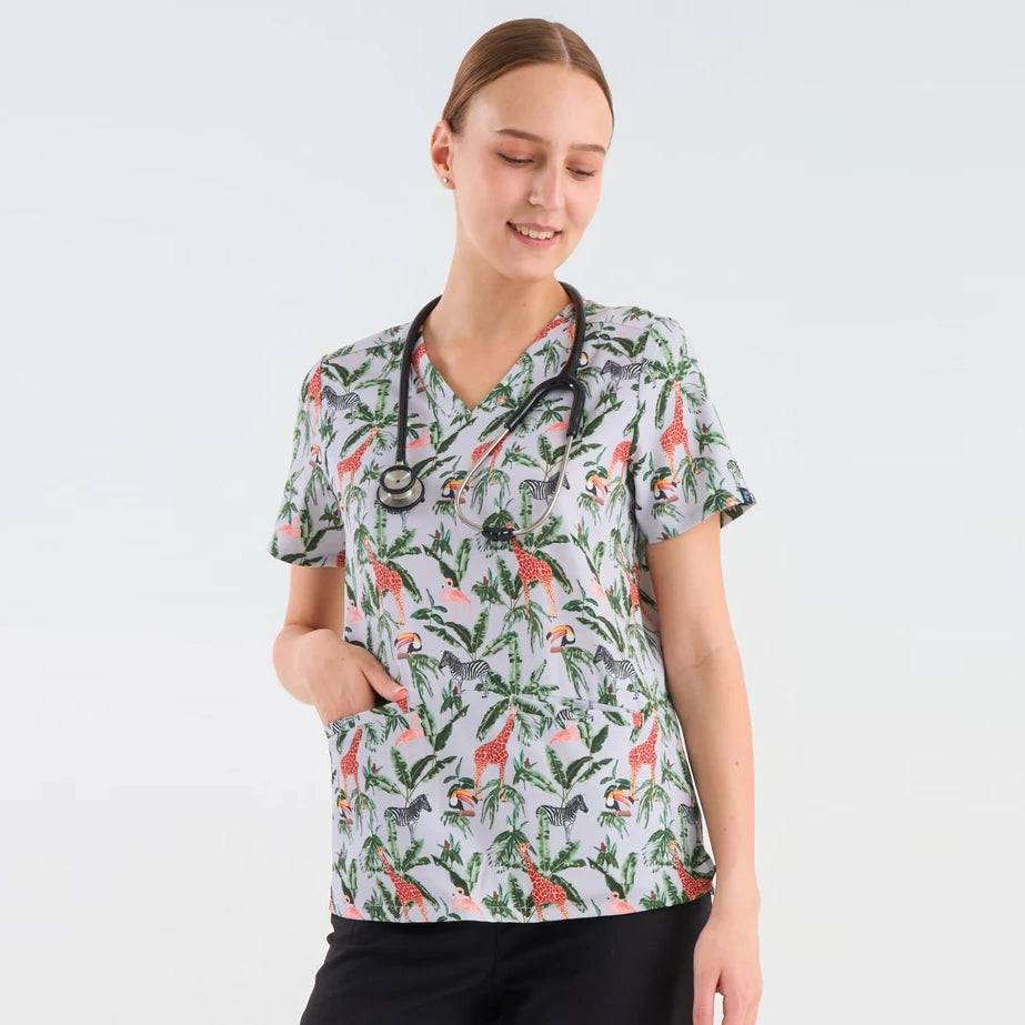 Wildly soft. Wildly comfortable. Wildly good. Feel as unique as a zebra, fancy as a flamingo, and grand as a giraffe in this breathable, sweat-wicking scrub top made for movement and comfort.
