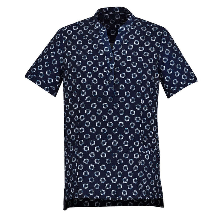 • Designed with a flattering Y-neck open and mandarin collar, simple lines and no chest pocket for a clean look