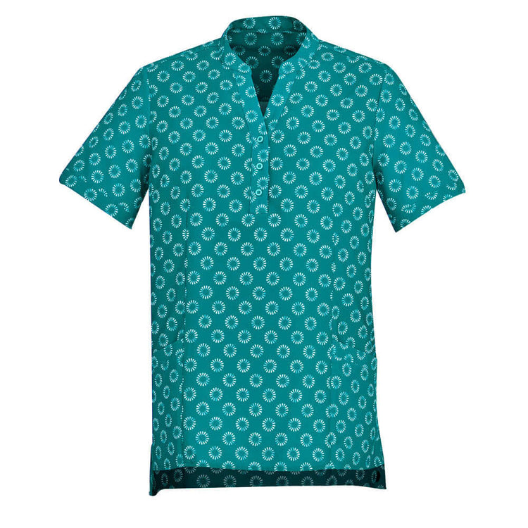 • Designed with a flattering Y-neck open and mandarin collar, simple lines and no chest pocket for a clean look