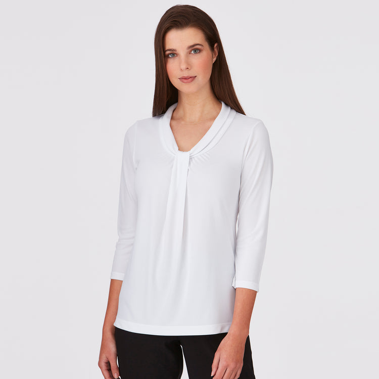 Exceptionally soft and cool to wear, Pippa Knit offers the ultimate in comfort. The unique and versatile draped neckline with gathered front detail creates a feminine look for the corporate environment. The stretch Matte Jersey is easy care and flatters all body shapes and sizes, making it the centrepiece of your working wardrobe.