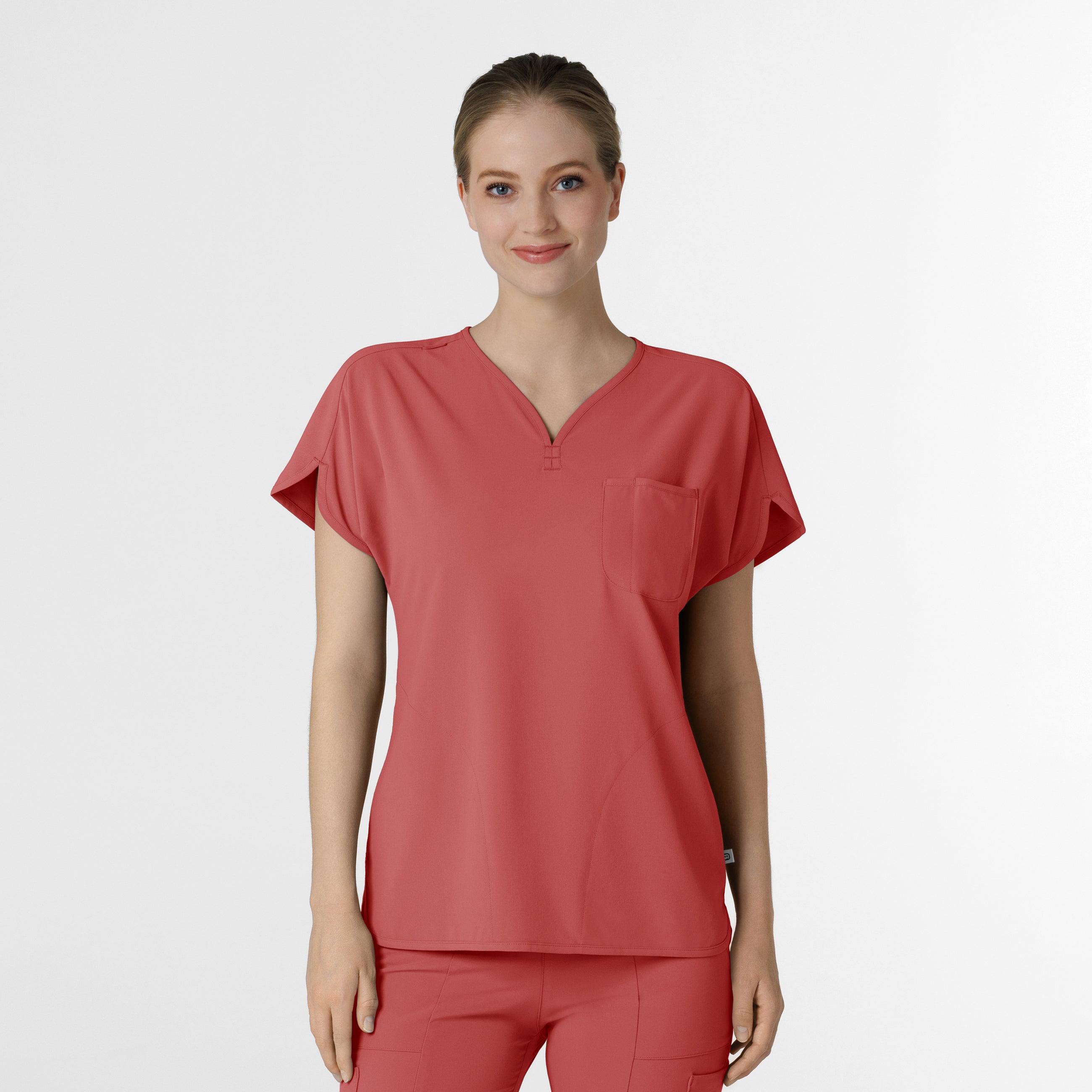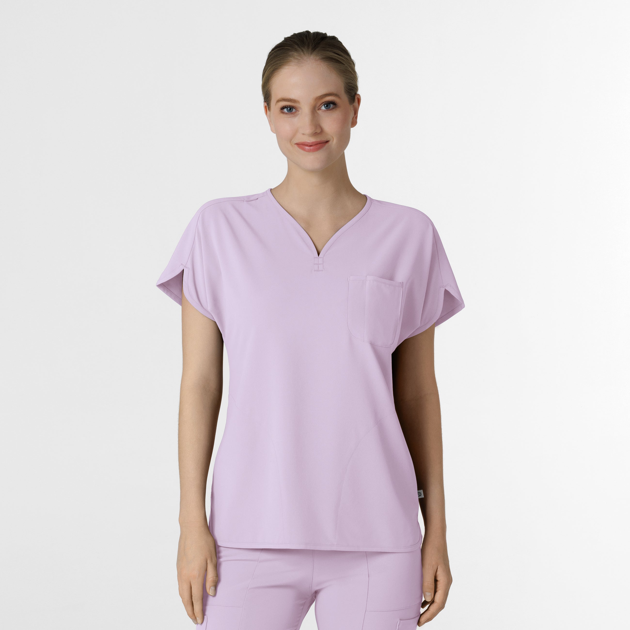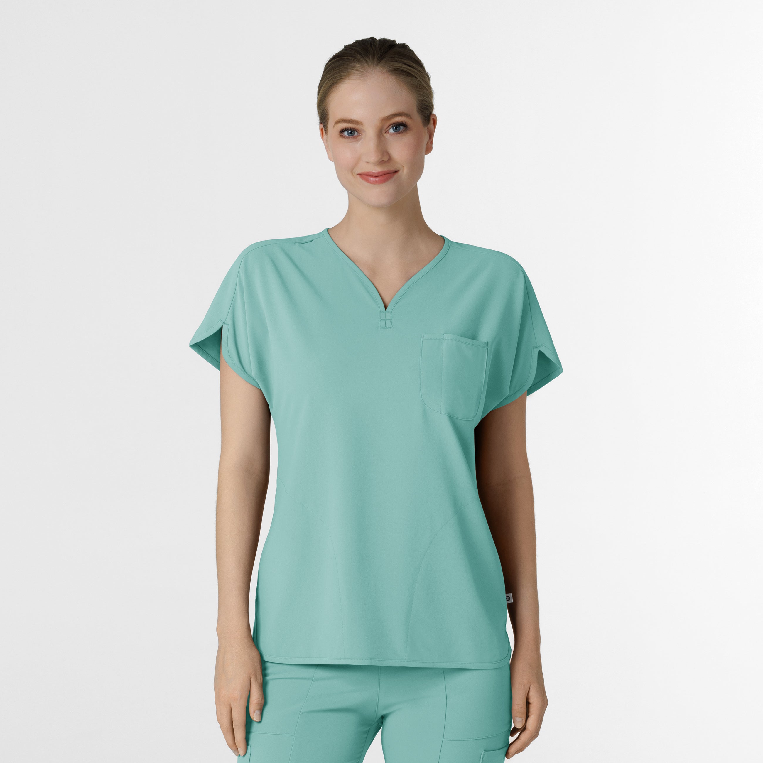 Enhance your workday with the Wink Women's Dolman Scrub Top. This fashionable scrub top features a Y-neck design and elegant dolman sleeves with binding details, offering a sophisticated silhouette that distinguishes you in the medical field. Crafted from a sustainable polyester blend that includes recycled materials, it aligns your workwear choice with eco-conscious values. Not only is this scrub top environmentally friendly, but it's also incredibly comfortable. The stretchy fabric allows you to move effortlessly during your demanding shifts, ensuring you stay focused on your patients, not your attire. You'll find practical details like a shoulder badge loop for your ID, a chest pocket with a pen slot, and two side entry pockets for your essentials. The binding finish at the dolman sleeve hem and side vents at the hem add a touch of finesse to your professional look. Make a positive impact on both your patients and the planet with this sustainable Poly-blend fabric scrub top.