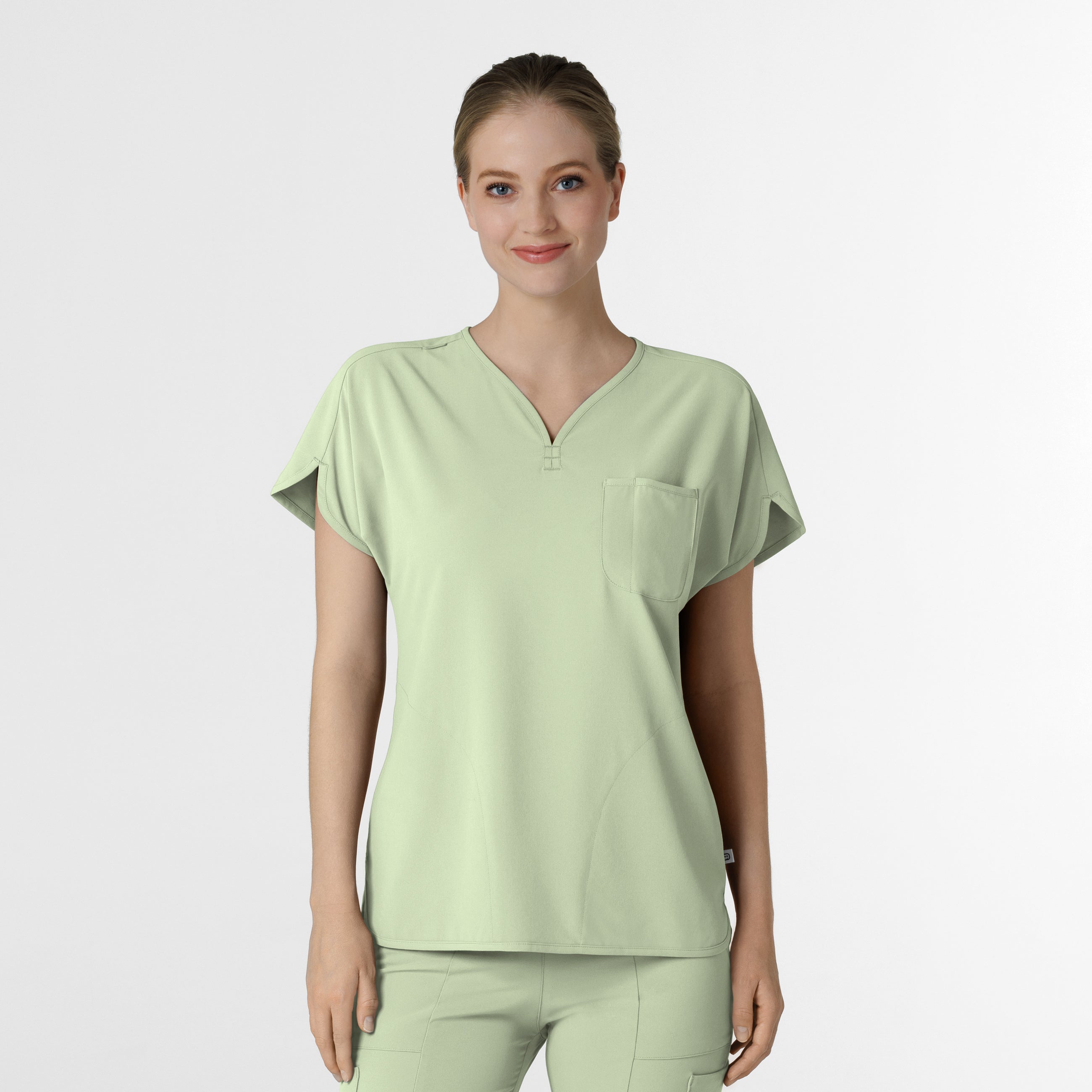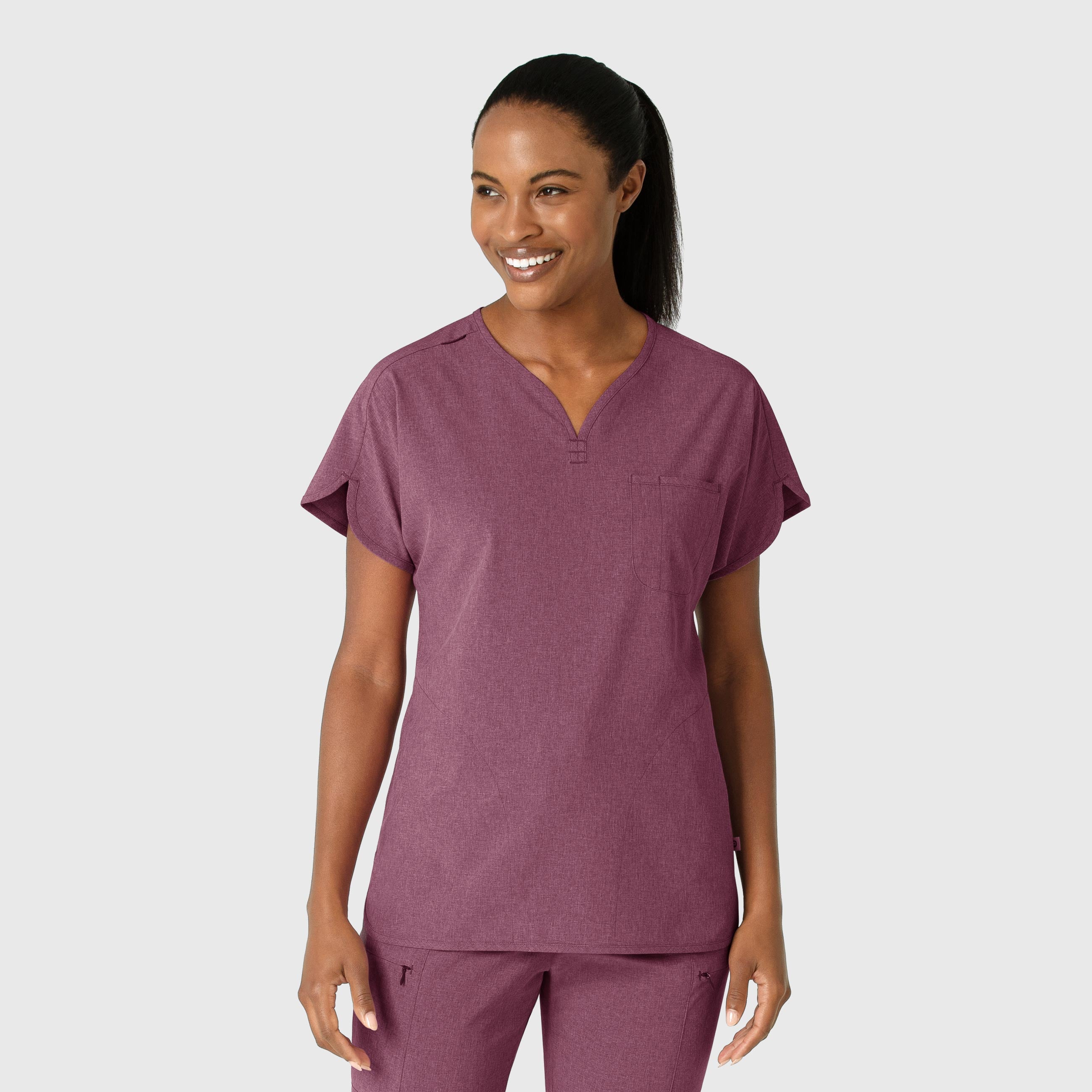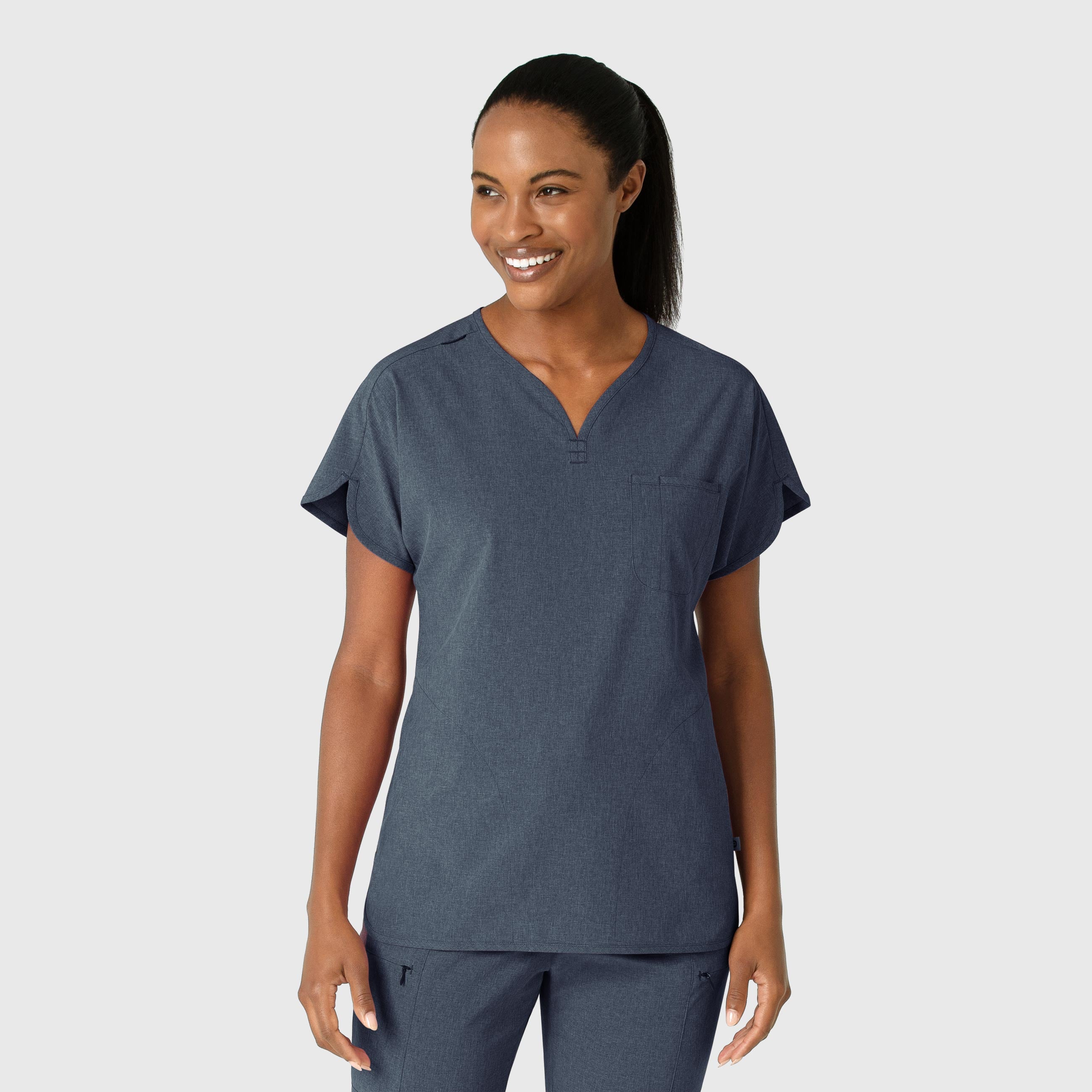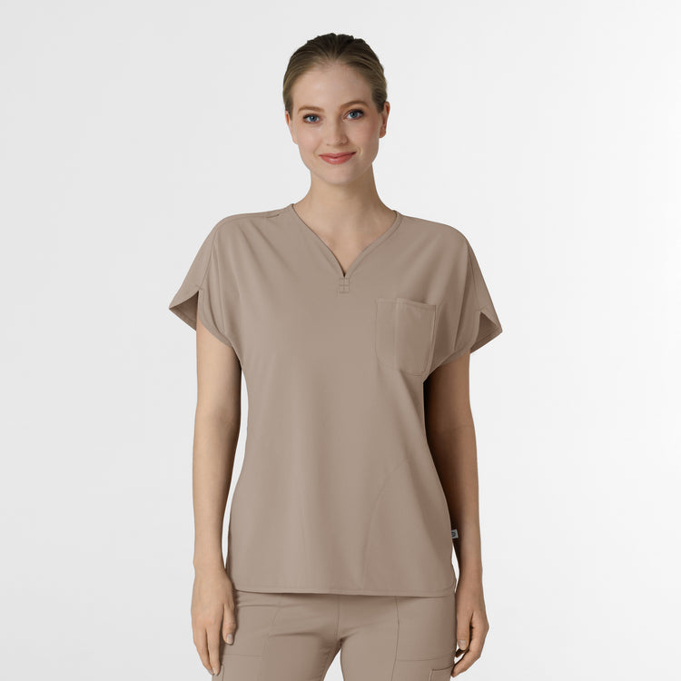 Enhance your workday with the Wink Women's Dolman Scrub Top. This fashionable scrub top features a Y-neck design and elegant dolman sleeves with binding details, offering a sophisticated silhouette that distinguishes you in the medical field. Crafted from a sustainable polyester blend that includes recycled materials, it aligns your workwear choice with eco-conscious values. Not only is this scrub top environmentally friendly, but it's also incredibly comfortable. The stretchy fabric allows you to move effortlessly during your demanding shifts, ensuring you stay focused on your patients, not your attire. You'll find practical details like a shoulder badge loop for your ID, a chest pocket with a pen slot, and two side entry pockets for your essentials. The binding finish at the dolman sleeve hem and side vents at the hem add a touch of finesse to your professional look. Make a positive impact on both your patients and the planet with this sustainable Poly-blend fabric scrub top.