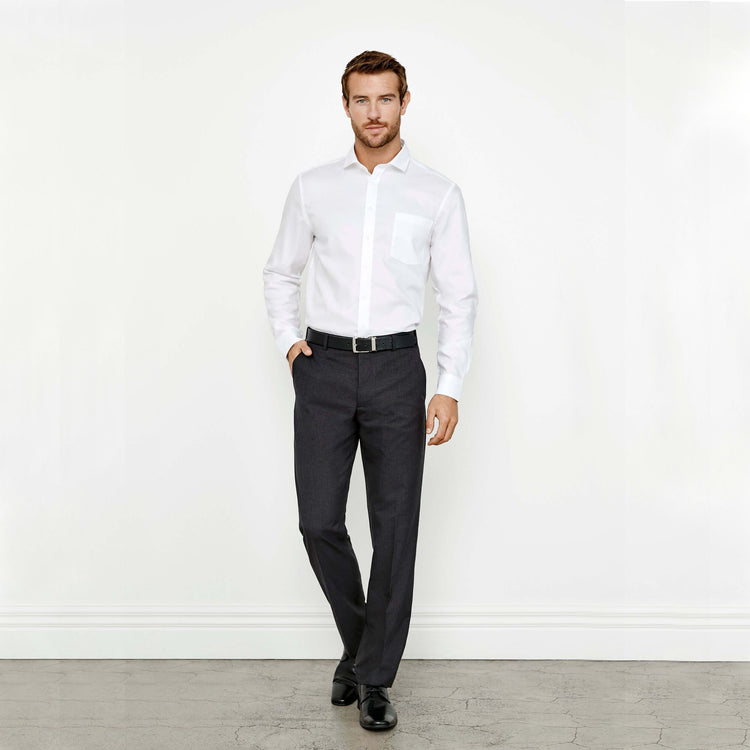 A perfectly tailored flat front pant in a classic fit. Designed to be your year round ‘go-to’ pant. Modern style that fits straight through the hip and thigh. Leg shape is not too wide or too slim. Regular fitting with a comfortable mid-rise that sits just below the natural waist and suits a wide variety of body shapes and sizes.