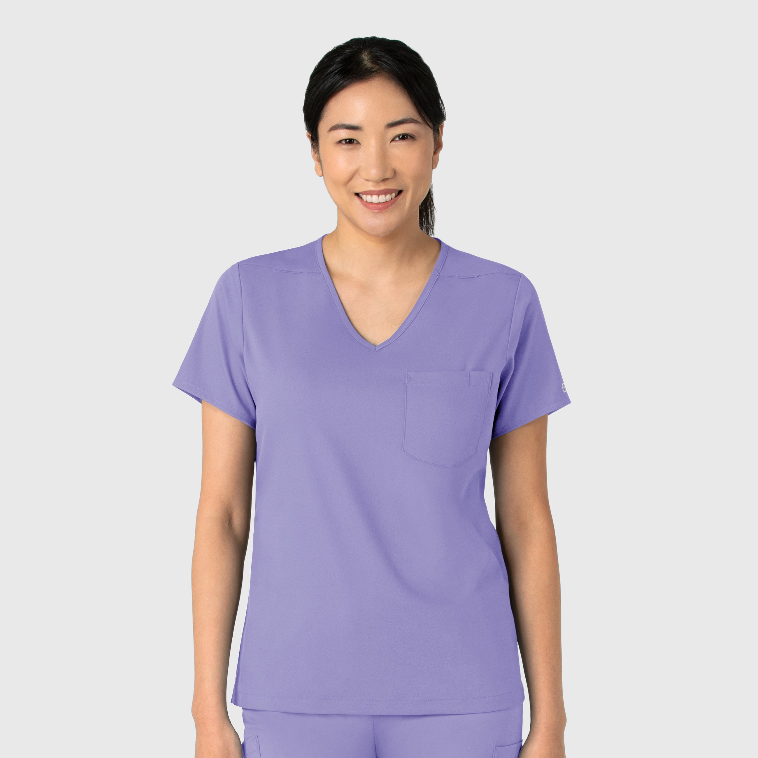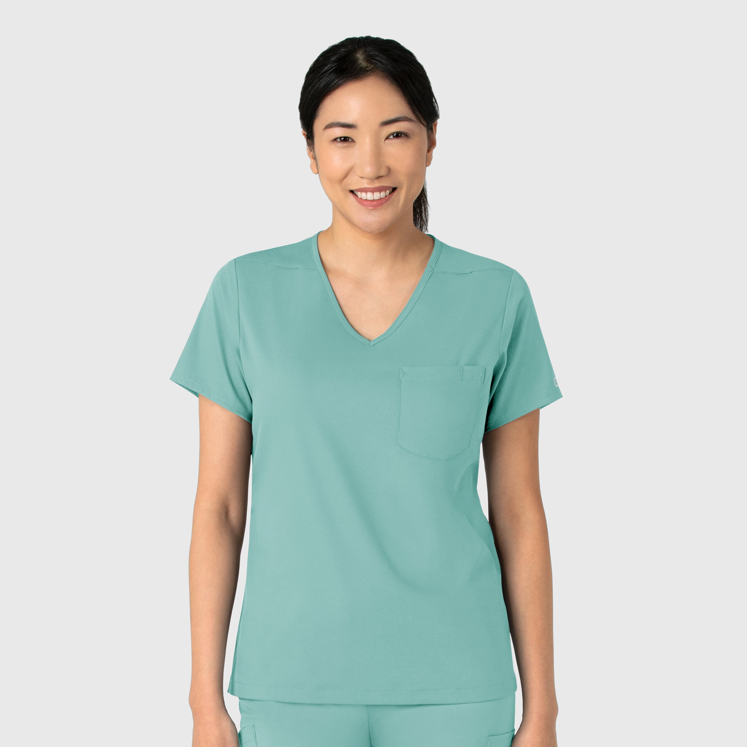 A softly curved V-neck and a high-to-low hem give this women's tuck-in scrub top a flattering fit that's modern and fresh. Pockets make sure practicality stays a priority, including a chest pocket that has a bar tack stitch for your pen, plus a back card pocket that zips shut to keep small items close and secure. A loop on both shoulders provides a place for your badge on whichever side you find more convenient. The modern fit strikes the perfect balance of letting you move freely without feeling like it's baggy or loose. Side hem vents open up the profile so you get full range of motion as you make your way through a shift. Tuck this scrub top into your favourite scrub pants or let it hang loose with its tailored drape. Built from a super soft and stretchy material, it's sustainably made - so while you're caring for your patients, you can know you're also doing your part to help protect the planet.