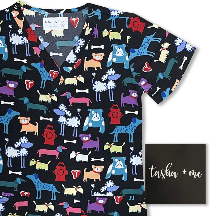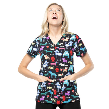 Womens Printed Scrub Top - Puppy Play