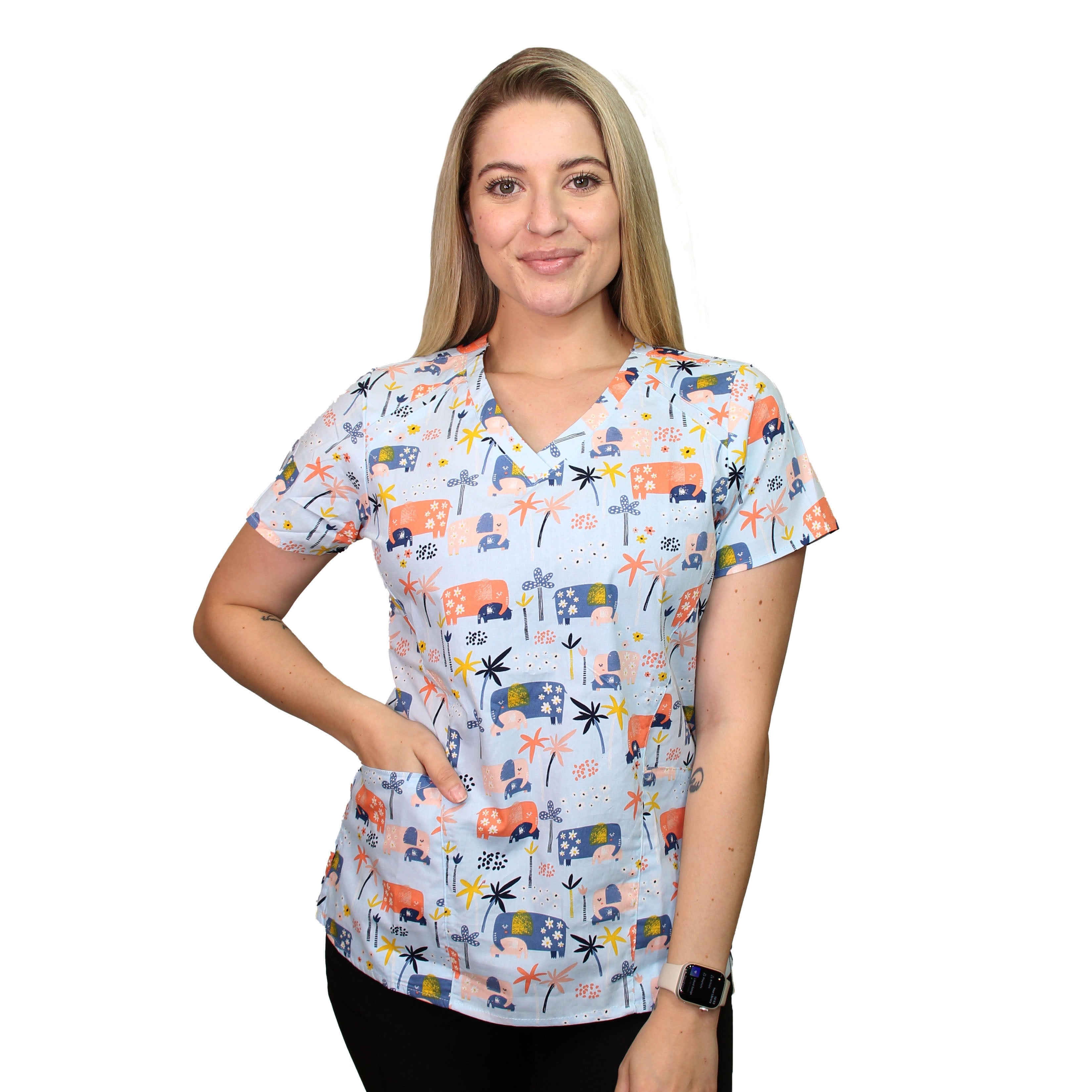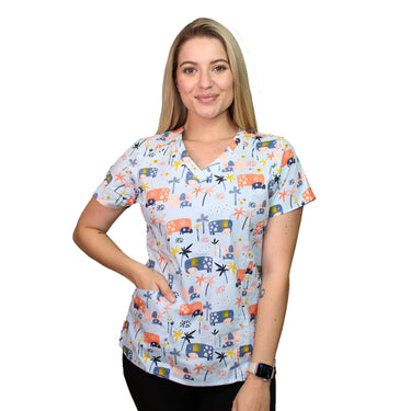 Brighten your workday with our Tropical Elephants Printed Scrub Top - the perfect blend of professional functionality and playful style for nurses, doctors, and healthcare workers across Australia.