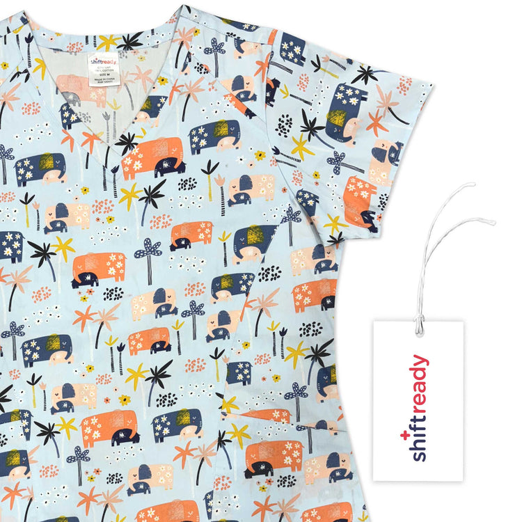 Tropical Elephants Printed Scrub Top - Women's Cotton Medical Uniform