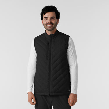 Stay cozy and stylish with this men's quilted scrub vest, perfect for layering over a long sleeve tee when the chill hits or the nurse's station feels like a freezer. The puffer-style quilted design adds comfort while Flex-n-Reach panels give you the stretch you need to move freely as you lift, lean, and reach throughout your shift. Keep your badge in full view with convenient loops at the shoulder and back neck for easy access.